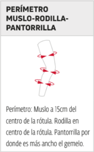 | Talla | Perímetro del Muslo (15 cm por encima del centro de la rótula) | Perímetro de la rodilla (medio de la rótula) | Perímetro de la pantorrilla (zona más ancha) |